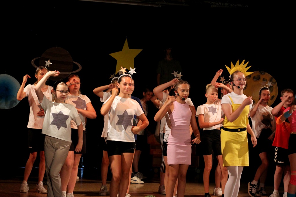 Im Rahmen der Fächer Sport, Deutsch und Musik studieren wir in jedem Schuljahr ein kleines Kindermusical ein, das im Juli auf der Bühne in unserer Aula aufgeführt wird. Dabei geht es vor allem um das Miteinander im Team. Wer gern singt und sich zu Musik bewegt, ist hier richtig! Vor Publikum auftreten oder lieber hinter den Kulissen bleiben? Jeder kann bei uns herausfinden, ob er gern in eine Rolle schlüpft und im Rampenlicht auf der Bühne steht, oder ob er sich lieber beim Malen und Basteln von Requisiten, beim Soufflieren oder bei der Licht-/ und Tontechnik engagieren möchte. Und wer ein Bandinstrument spielt, ist in unserer Live-Musicalband genau richtig.